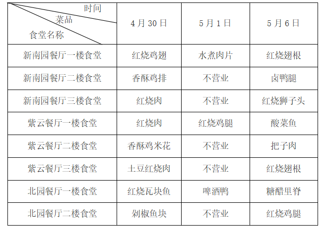 两个校区其余学生食堂5月1日-5月4日停止营业,5月5日晚餐恢复供餐。教工餐厅假期不营业,5月6日恢复供餐。
