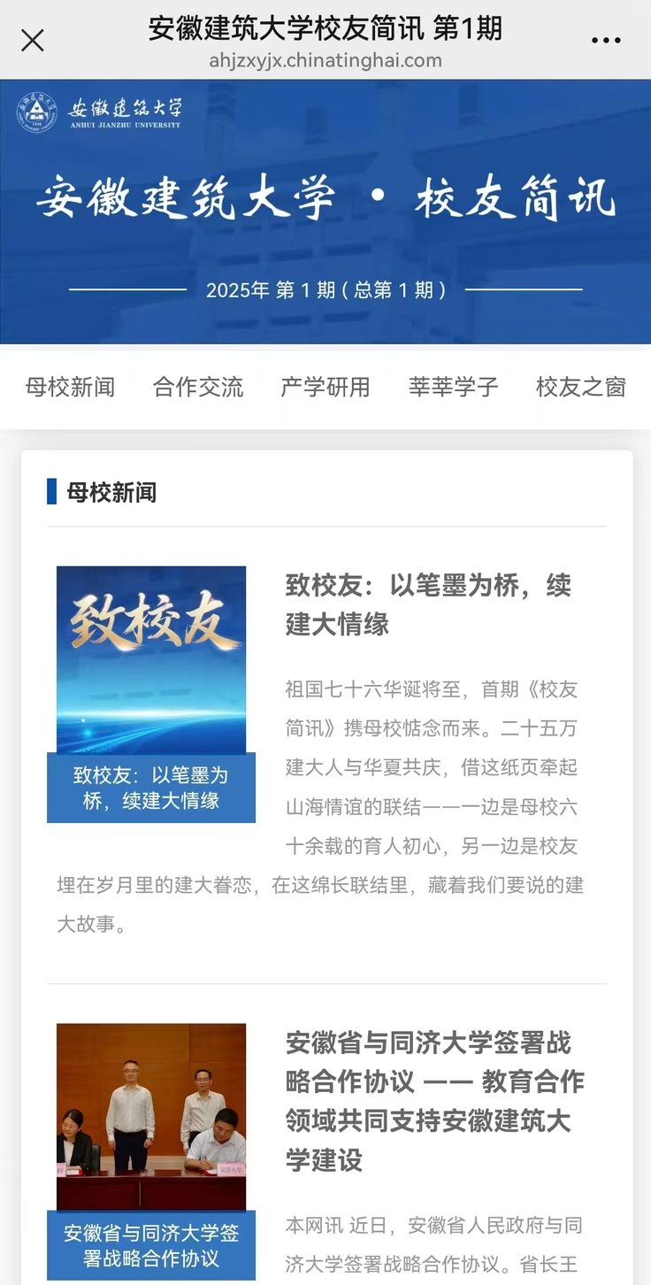 校友简讯的诞生,源于母校对校友的深情惦念,更旨在构建一个“信息互通、情感互联、发展互促”的精神家园。简讯设有“母校要闻、合作交流、产学研用、莘莘学子、校友之窗”栏目。其中“母校要闻”着眼于建大在高质量发展道路上的坚实步履;“合作交流”展现着母校开放办学的广阔格局;“产学研用”聚焦建大人服务国家战略的责任担当;“莘莘学子”见证后辈传承建大精神的蓬勃朝气;“校友之窗”则搭建了专属于建大人的风采舞台。我们同样诚挚期盼全体校友提笔供稿,让每份牵挂都化作联结彼此的情感纽带。