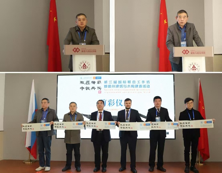 本网讯 2025年11月11日上午,“徽匠传薪·中俄共构”第三届国际联合工作坊暨徽州建筑与木构建造活动启动仪式在我校紫云路校区徽韵楼隆重举行。校党委副书记、校长蔡国军,俄罗斯下诺夫哥罗德国立建筑与土木工程大学校长谢戈列夫·德米特里出席并致辞,共同宣布活动正式启动,校党委常委、副校长杨科主持仪式。省教育厅外事处处长姚德勇,省外办友城处副处长李欣宇,省土木建筑学会常务副理事长冯卫,安徽地平线建筑设计有限公司总建筑师吴前宏,以及中俄双方师生代表等出席仪式。