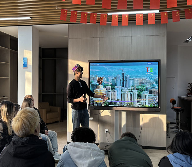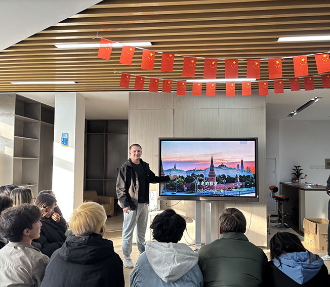 当日下午3开始,现场氛围热烈。来自塔吉克斯坦的学子以家乡城市风貌为切入点,生动展示了当地独具特色的建筑景观与深厚的人文底蕴;也门学生身着传统服饰,详细分享了本国特色民俗与服饰背后的文化内涵;柬埔寨、印度尼西亚的学生则聚焦“烟火人间”,不仅细致拆解了舂蕉叶、桑赫拉等特色美食的制作工艺,更深入阐释了美食中承载的团圆、祈福等文化寓意;俄罗斯学生以红场等知名地标为线索,娓娓道来本土悠久的历史脉络与鲜明的文化符号,让在场师生仿佛身临其境。