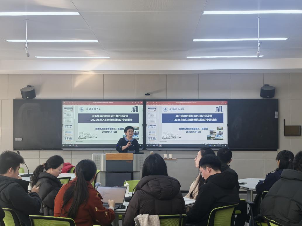 党委统战部副部长陈剑锐作《凝心铸魂启新程 同心聚力促发展》专题报告。陈剑锐部长重点介绍了我校统战工作的基本情况,详细说明了校内各民主党派组织、党外知识分子联谊会等团体的构成与活动,阐述了中国共产党领导的多党合作和政治协商制度在高校的具体实践。她强调,高校是人才培养和思想文化的重要阵地,作为教育工作者,在课堂教学、学术活动、网络言论等所有场合,都必须始终保持高度的政治敏锐性和责任感,注意自身言行,恪守职业道德规范,严守政治纪律和政治规矩。她勉励新教师要自觉加强思想政治理论学习,坚定理想信念,不仅要传授专业知识,更要成为学生思想上的引路人,帮助学生树立正确的世界观、人生观、价值观,共同维护校园和谐稳定的政治局面。