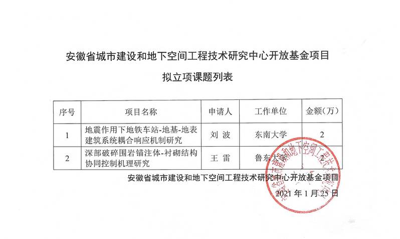 根据《安徽省城市建设和地下空间工程技术研究中心开放基金课题管理办法(试行)》文件规定,本中心按照“公平公正、择优支持”的原则,采取自由申请、实验室初审、学术委员会终审的程序遴选确定3个项目准予立项,现将拟立项项目予以公示。公示期为2021年1月25日-1月31日,如有异议,请向安徽省城市建设和地下空间工程技术研究中心和安徽建筑大学科技处反应。