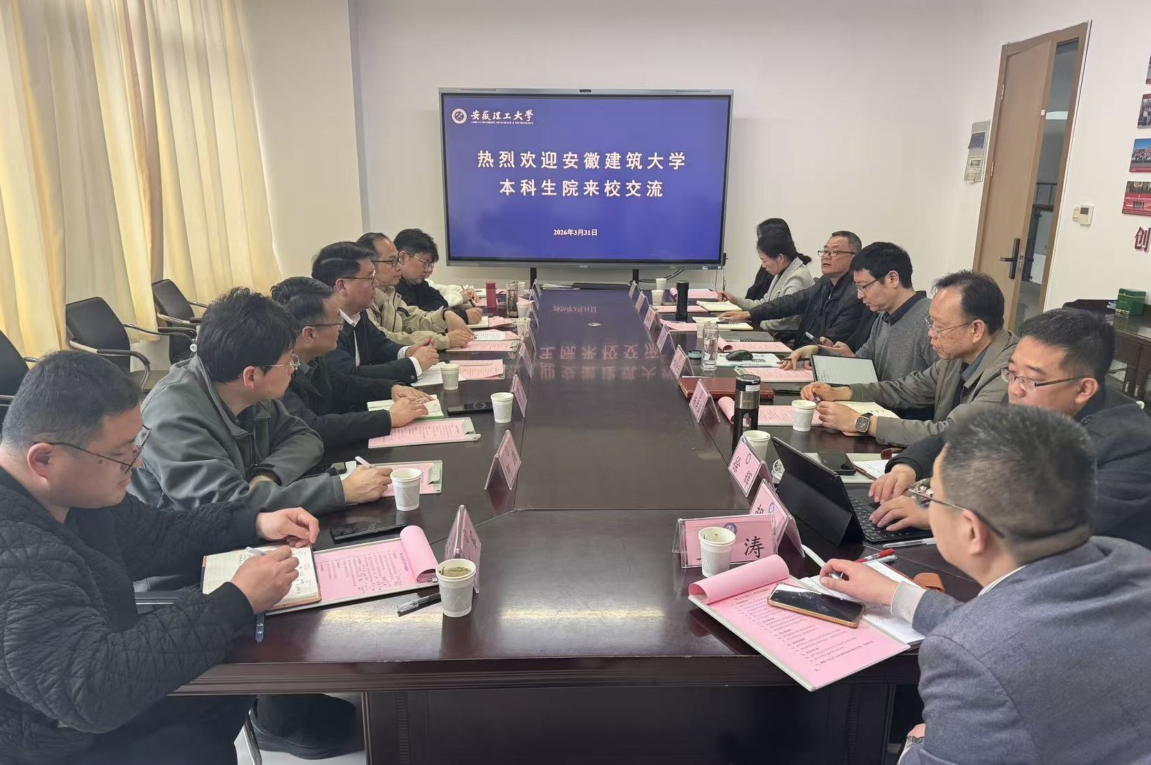 本网讯 为学习借鉴本科教学管理的先进经验,3月31日上午,我校本科生院院长马巍一行8人赴安徽理工大学开展调研交流。交流会议在安徽理工大学行政楼218会议室举行,安徽理工大学教务处处长刘令云主持会议,安徽理工大学教务处、创新创业学院相关负责人参加会议。