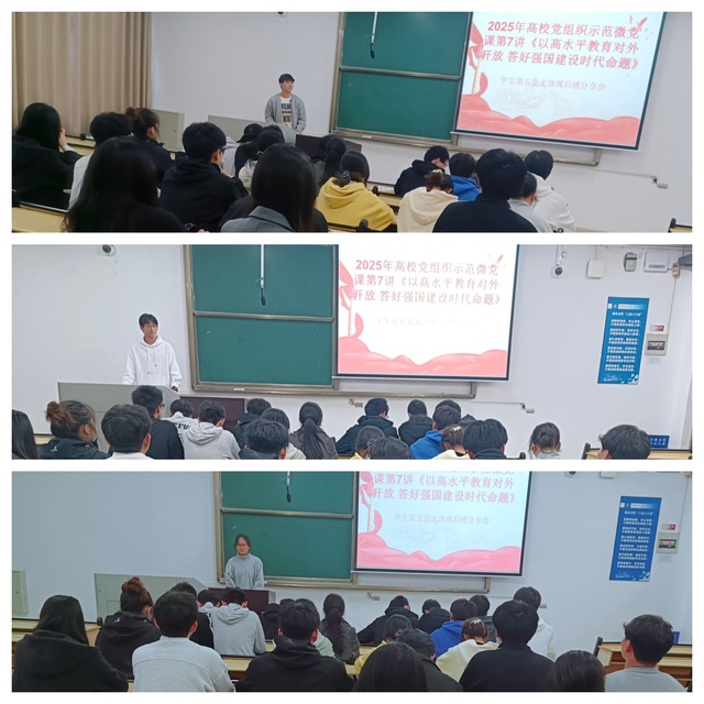 本网讯 11月7日下午,机电学院学生第五党支部学习观看2025年高校党组织示范微党课第7讲《以高水平教育对外开放 答好强国建设时代命题》,并开展讨论交流。活动由党支部书记杨慧主持。