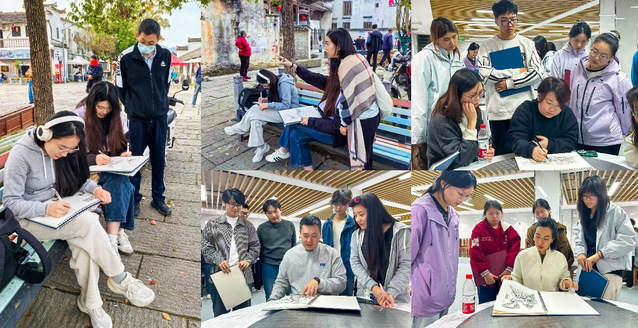 立足工业设计专业特色,支部将红色元素深度嵌入专业实践环节,组织学生深入屏山、南屏、宏村等典型徽州古村落,开展徽州风貌写生及非遗体验的主题实践。通过实地调研、美学分析、手工制作的进阶式教学设计,引导学生在系统观察徽派建筑空间智慧、亲身体验非遗技艺制作过程中,不仅锻炼了专业技能,更从传统营造智慧与工匠精神中感悟了以人为本、精益求精的设计哲学,实现专业能力与文化自信的双重提升。