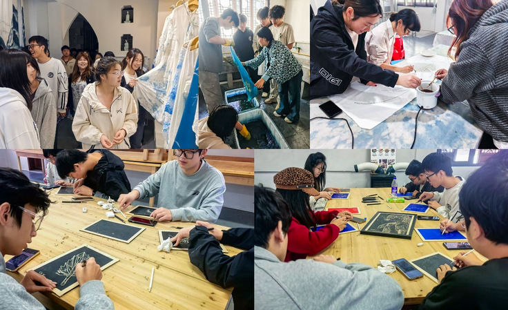 调研非遗技艺,学生们参与了蜡染、木刻画等传统工艺制作体验。通过学习拓印、刻刀使用、蜡染分层染色等技法,学生将前期采集的徽州元素转化为可视化的设计作品,展现了学生对非遗文化的理解与创新表达。