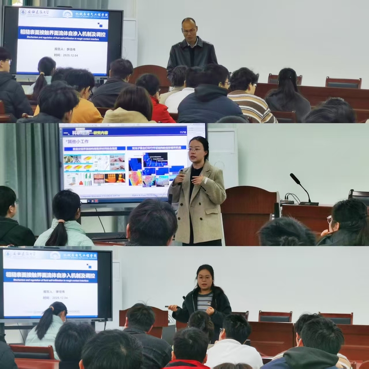 季佳伟博士以“粗糙表面接触界面流体自渗入机制及调控”为题,围绕功能表面设计与装备、界面微纳流动特性以及摩擦界面性能调控三大核心内容进行了系统讲解,为研究生拓宽科研视野、掌握科研方法提供了重要启发。