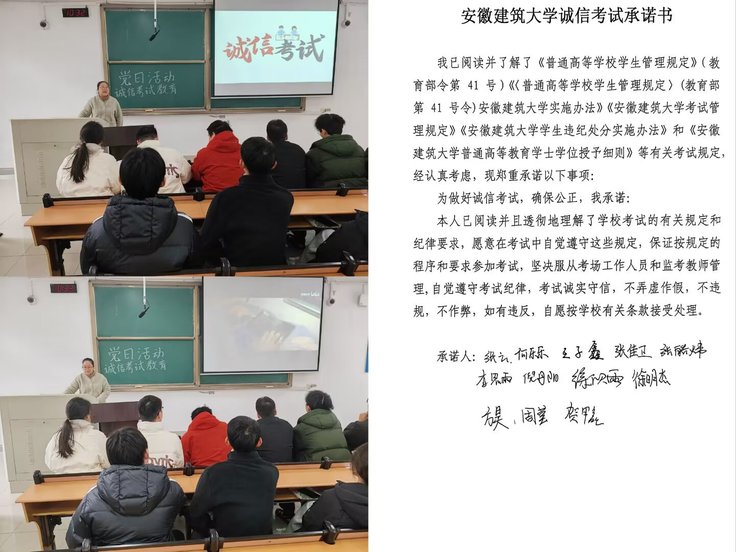 支部书记带领党员集中学习《国家教育考试违规处理办法》《安徽建筑大学考试管理规定》《安徽建筑大学学生违纪处分实施办法》和《安徽建筑大学普通高等教育学士学位授予细则》等有关考试规定,明确“作弊零容忍”的底线要求。同时,通过剖析近年来教育系统内发生的典型考试违纪违法案例,详细阐述作弊行为对个人学业、职业生涯及社会诚信体系的严重危害。