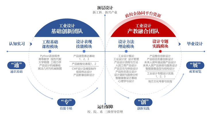 专业坚持基于课程群的多层次闭环反馈项目式人才培养模式,以学生实践技能成长路径,强化课程关联性,构建“工程基础课程模块”、“设计表现技能模块”、“设计方法理论模块”、“设计专题实践模块”,重构课程内容,以模块化的课程群,让学生依次明确专业学习的目的、提升专业的认知、提升专业技能、产生不同的专业研究倾向、提升专业实践与应用能力,最终通过政校企合作项目、设计竞赛、成果展览等方式,以“通(通识基础)—专(技能专精)—创(创新实践)—展(成果展览)”四位一体的方式,共同完成具有创新意识和实践能力的工程技术人才的培养。