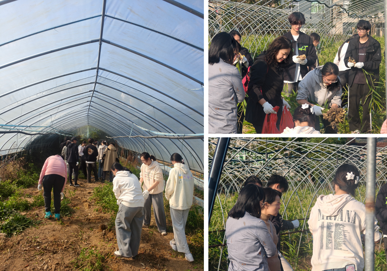 在最后的劳动实践环节,师生集体走进学校对口帮扶建设的现代化蔬菜大棚,开展沉浸式农耕体验。大家依次参与拔草、除虫、采摘等环节,在亲手劳作中理解农业生产的不易与科技农业的创新价值。农业大户对比传统种植与现代农业的差异,重点说明绿色防控、节水滴灌等技术如何实现“减药增效”。通过这种“田间课堂+能手带练”的模式,师生不仅锤炼了务实作风,更在实践中深化了对农业现代化、乡村振兴战略的认知。