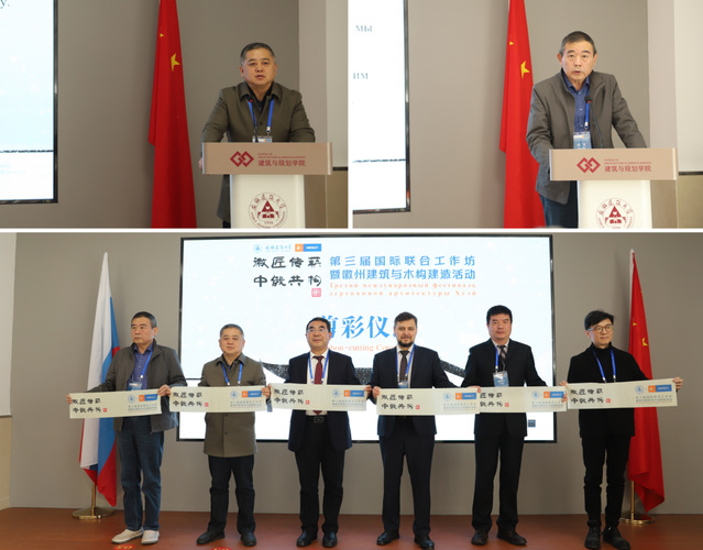 本网讯 2025年11月11日上午,“徽匠传薪·中俄共构”第三届国际联合工作坊暨徽州建筑与木构建造活动启动仪式在我校紫云路校区徽韵楼隆重举行。校党委副书记、校长蔡国军,俄罗斯下诺夫哥罗德国立建筑与土木工程大学校长谢戈列夫·德米特里出席并致辞,共同宣布活动正式启动,校党委常委、副校长杨科主持仪式。省教育厅外事处处长姚德勇,省外办友城处副处长李欣宇,省土木建筑学会常务副理事长冯卫,安徽地平线建筑设计有限公司总建筑师吴前宏,以及中俄双方师生代表等出席仪式。