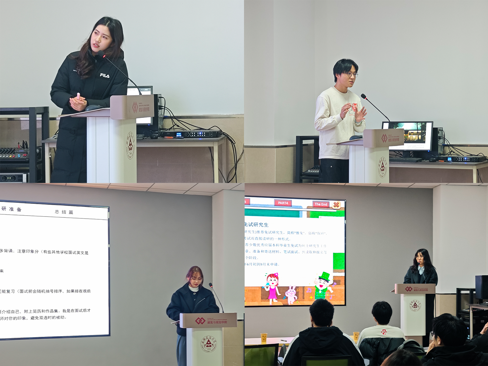 五位党员青年立足建筑类学科保研特点,结合自身推免实践与成长历程,从多维度展开深入分享。他们不仅围绕学业精进、社会实践、双创项目筹备等通用要点倾囊相授,更紧扣专业特色,重点解读了城乡规划设计、建筑方案创作、风景园林景观营造等领域的学科竞赛备赛技巧,以及作品集打磨、专业论文撰写等保研核心材料的准备策略,深度剖析学科竞赛、专业实践在保研评价体系中的关键作用。分享过程中,嘉宾们还结合自身党员身份,分享了如何将理论学习与专业实践相结合、在志愿服务中锤炼品格的心得,以朋辈引导的方式,为学弟学妹们奉上兼具专业性与思想性的升学“锦囊”。