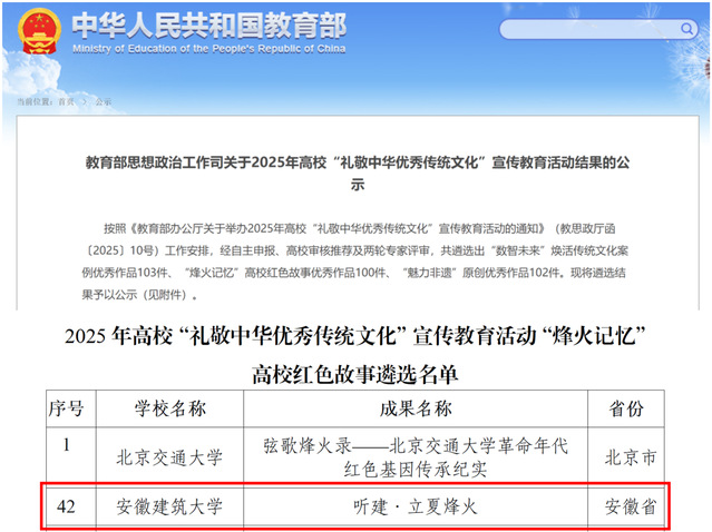 本网讯 近日,教育部公布了2025年高校“礼敬中华优秀传统文化”宣传教育活动遴选结果。由我校党委宣传部和建规学院联合报送的微电影《听建·立夏烽火》成功入选“烽火记忆”高校红色故事优秀作品名单。