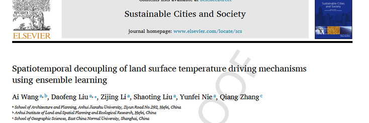 本网讯近日,安徽建筑大学建筑与规划学院教师在城乡规划领域顶级期刊《Sustainable Cities and Society》(中科院一区Top期刊,2025年影响因子12.0)上发表了题为《Spatiotemporal Decoupling of Land Surface Temperature Driving Mechanisms Using Ensemble Learning》的研究论文。教师王爱为论文第一作者,2023级硕士研究生刘道烽为通讯作者,安徽建筑大学为第一完成单位。