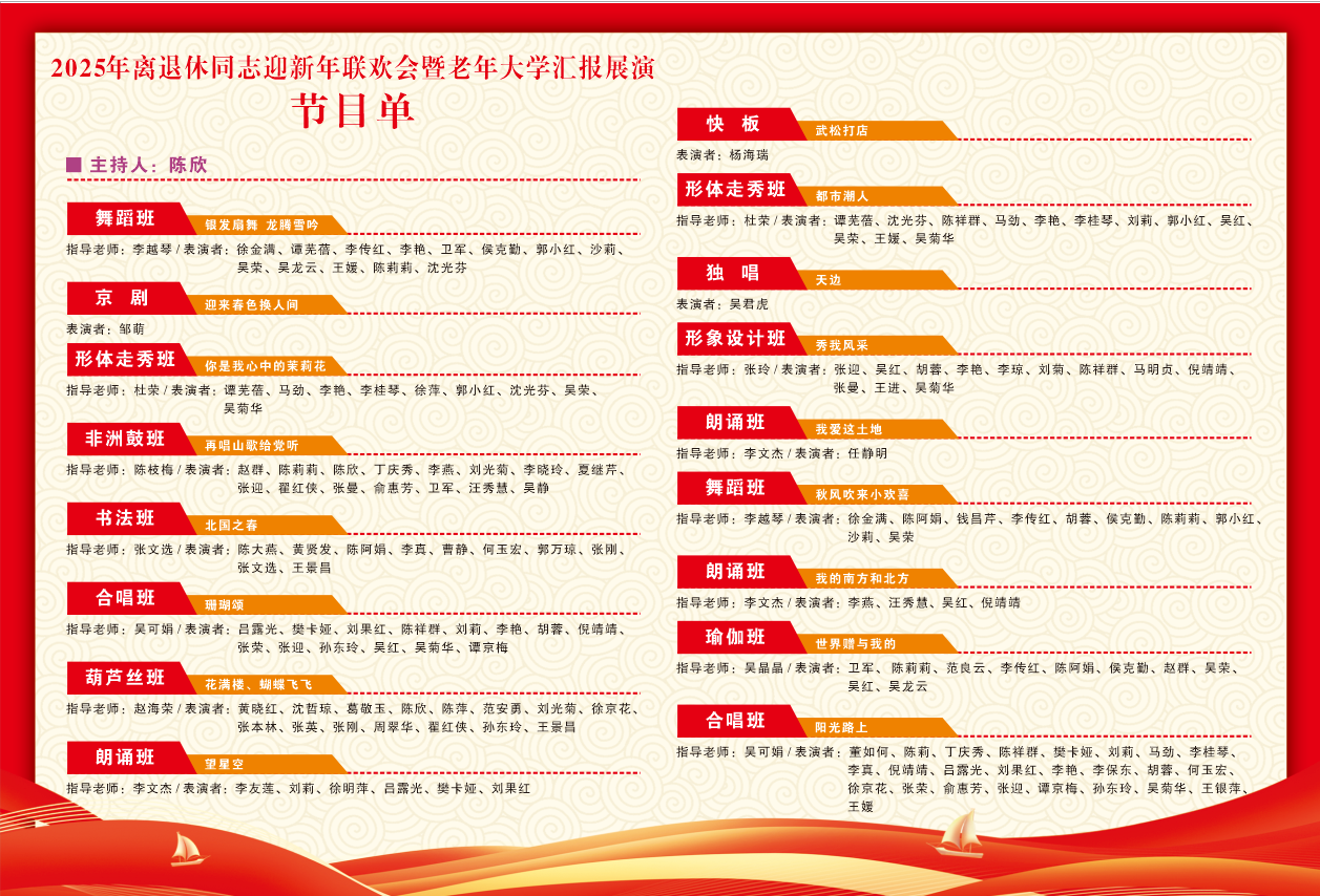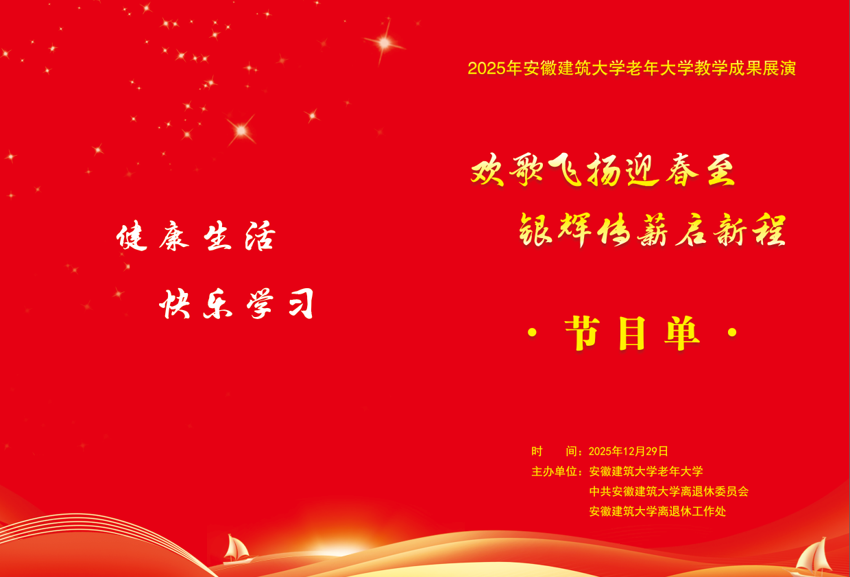 辞旧迎新,迎春接福。为增进离退休同志之间的交流,离退休工作处举办2025年度校情通报会、“欢歌飞扬迎春至,银辉传薪启新程”离退休同志迎新年联欢会暨老年大学教学成果汇报展演会,诚邀您前来参加!