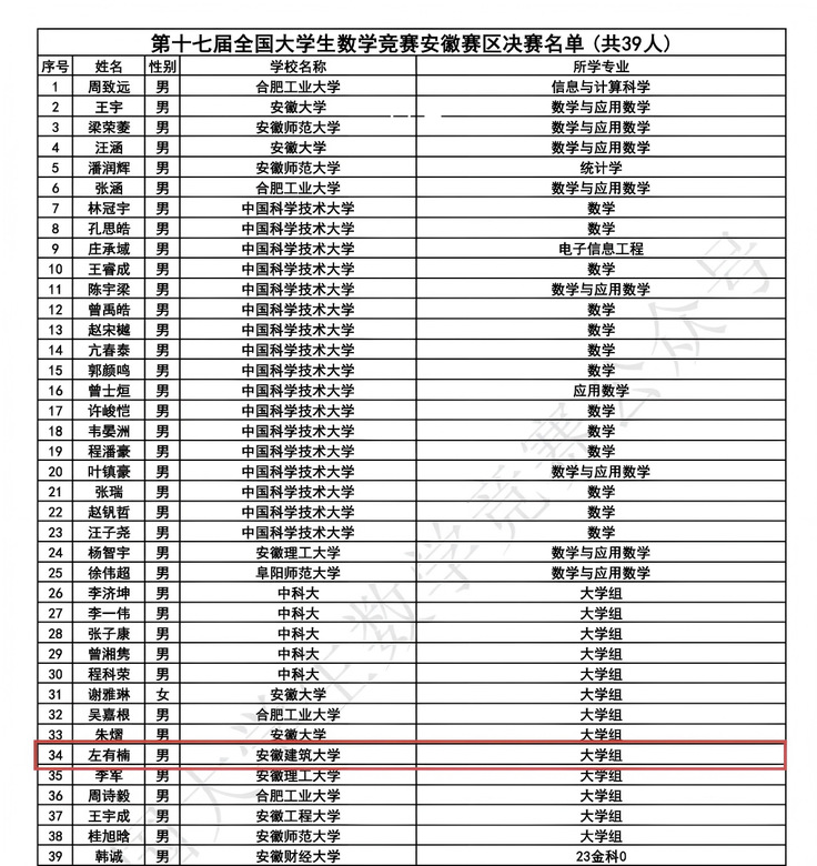 本网讯 近日,第17届全国大学生数学竞赛决赛名单公布,由数理学院赵林老师指导的我校环能学院2022级建筑环境与能源应用工程专业学生左有楠,从安徽赛区6990名参赛者中脱颖而出,成功入围全国总决赛。安徽赛区本届仅有39人晋级全国决赛,此次入围实现了我校在该赛事的历史性突破。