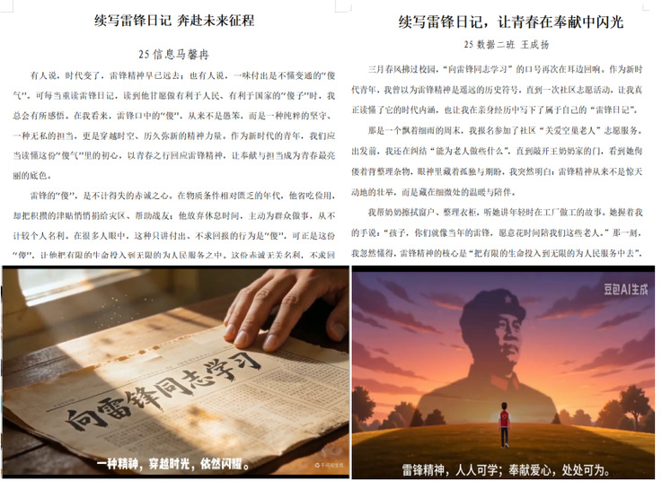 活动期间,学院组织开展了“学雷锋”主题征文与影像作品征集活动,引导广大学子以文字书写感悟、以镜头定格担当。同学们积极运用AI绘画、短视频等新媒体技术,创作出一批富有时代特色的数字文化作品,让雷锋精神在指尖传承、于云端绽放,以青年喜爱的表达方式焕发其蓬勃生机,激励更多青年在续写新时代雷锋故事的道路上坚定前行、贡献青春力量。