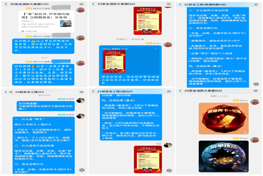依托班级QQ群、专业大群、班委工作群等线上阵地,学院搭建起全方位、常态化的反诈网络宣传矩阵,打通反诈宣传“最后一公里”,实现反诈知识随时随地可学、风险提示随时可看。各班级辅导员、班委第一时间在QQ群、微信群内转发学校及学院下发的反诈官方通知、最新诈骗预警信息、典型案例剖析推文、反诈科普短视频、校园安全警务提示等内容,有效做好专项提醒,确保每一条反诈通知精准传达至每一位学生,切实筑牢线上线下双重防护网。
