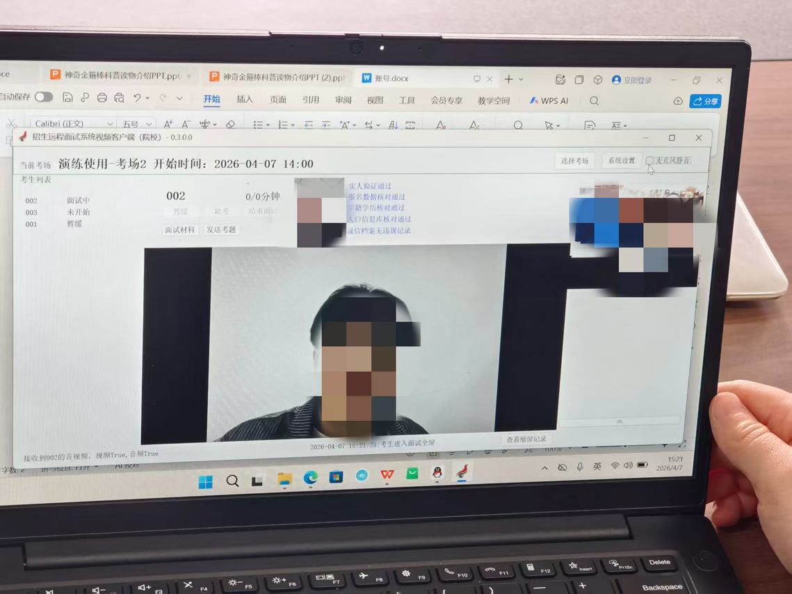 理论培训结束后,实战模拟演练正式启动。演练严格按照研究生远程面试实际流程开展,演练前建立六个远程面试考场,调剂考生、主候考官、工作人员全部到位,全程还原候考实人验证、双机位测试、邀请面试、成绩录入等各个环节。演练过程中,考生依次进入远程面试考场,主候考官按照面试流程进行了面试,工作人员做好设备保障,全面检验了远程面试平台的稳定性、操作流程的规范性以及各岗位人员的协同配合能力。