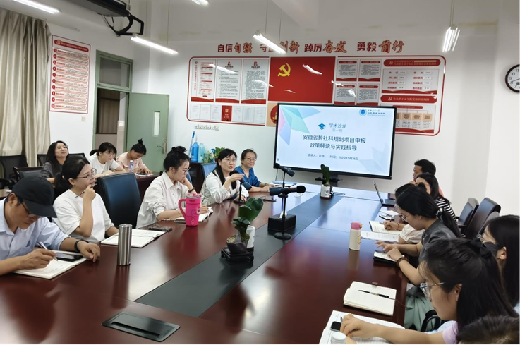 本次学术沙龙活动共分两个阶段进行。第一阶段是主题报告阶段,思想道德与法治教研室主任宣璐老师作题为《安徽省哲社规划项目申报政策解读与实践指导》的主题报告。她结合今年申报教育部、省哲社等各类项目的亲身体会,重点围绕2025年度省哲社科规划项目申报的相关政策和填报申报书的核心要点进行讲解,包括项目的类别、选题的创新性、研究内容的逻辑性、申报书撰写的规范性等,并分享了申报过程中的常见问题及解决方法。特邀嘉宾安徽大学马克思主义学院博士后王友叶也分享了科研项目申报经验和体会,他结合自己国家社科项目的申报经验,提出科研项目申报的要点,选题要紧扣时代需求,突出创新性;内容要逻辑清晰,边界明确;申报过程中要广泛听取意见,持续改进。第二阶段是项目申报交流阶段,教师们围绕如何找到科研真问题和青年项目申报要点以及现在正在写作精修过程中的困扰等问题,与两位老师进行了热烈的讨论和交流。参会教师深受两位主讲老师宝贵建议的启发,表示将进一步优化选题,不断打磨项目申报书,力争实现新突破。