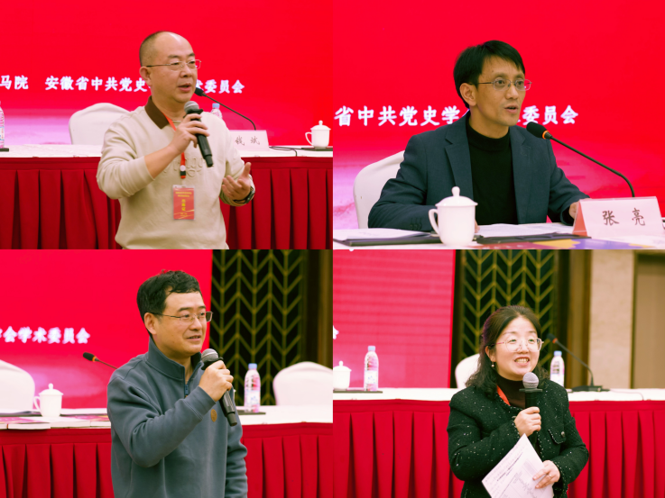 研讨会聚焦安徽党史上的重大事件与重要人物、安徽党史资源的挖掘与保护利用、新时代背景下党史研究的学术创新与方法革新、安徽党史与区域现代化建设及乡村振兴间的内在关联、党史资源数字化传播与新媒体应用五大议题,十位党史领域研究专家先后作重点发言。安徽省中共党史学会常务副会长、淮南师范学院吴玉才教授从激活高校党史人才队伍、强化高校党的政治建设、挖掘地方党史资源等方面来阐述了发挥高校党史优势,探索党史研究和教育的新路径。安徽省中共党史学会副会长、合肥工业大学陈殿林教授从社会背景、思想传播、组织基础等维度介绍了团队关于马克思主义在安徽早期传播有关情况的最新研究成果。中国科技大学钱斌教授提出了做好党史教育所应具备的底气、情怀和方法,指出了红色口述史在党史教育中的独特价值,并分享口述历史的系列成果。安徽金寨干部学院胡遵远教授以金寨县为例,提出通过提高认识、深化研究、打造传承高地、做亮品牌、完善顶层设计、成立专门机构、壮大研究队伍、强化资金保障等举措,确保红色资源的开发、利用与传承工作落到实处,为地方高质量发展提供持续动力。中共池州市委党史和地方志研究室副主任李运动认为,抓典型、擦亮牌子是做好党史资源开发与利用的重要一环。黄山市委党校副教授郗延红认为,应从健全机制、加强引导,纳入发展战略等方面来挖掘保护和活化利用皖南山地红色资源。安徽工程大学方前移教授结合红色文化研究智库平台的研究成果,多维阐释了党史研究学术创新与乡村振兴之间的内在关联。安徽科技学院王凤杰教授以自己在学术研究和教学实践中遇到一些问题为思考起点,引入“他者”视角,深度分析了党史研究的基本问题。安庆师范大学副教授张俊生着眼安徽拥有丰富的红色文化资源,从注重思想引领、内容创新、载体创新、融合发展和机制创新等方面提出了推动安徽红色文化资源创造性转化和创新性发展的思考路径。安徽建筑大学张亮教授结合自身多年研究,提出应该加强对新中国史与改革开放史的学术研究,将历史研究和文化遗产研究结合起来,进一步加强淠史杭红色水利文化的开发。