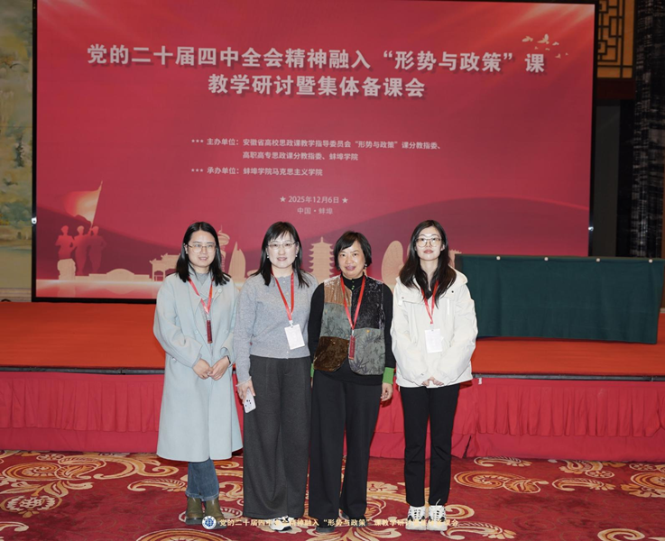 本网讯 为深入学习贯彻党的二十届四中全会精神,推动“形势与政策”课高质量发展,切实将全会精神转化为思政课育人实效,2025年12月6日至7日,党的二十届四中全会精神融入“形势与政策”课教学研讨暨集体备课会在蚌埠学院举行。我院四位教师代表参加会议。