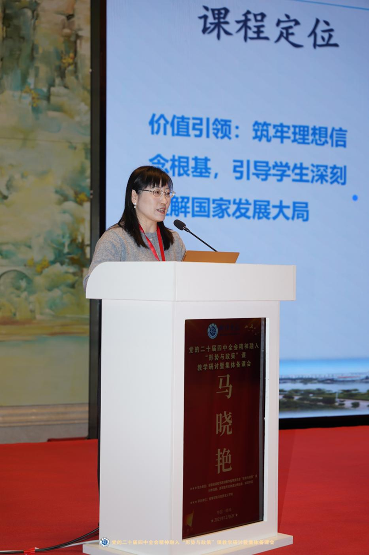 与会教师围绕“因地制宜发展新质生产力”“经纬一体推进党的二十届四中全会精神融入‘形策’课”等主题,分别进行政策阐释、示范教学、经验介绍。在专家论坛环节,我院院长马晓艳教授应邀作题为《融合·赋能·引领:打造具有工科特色的形势与政策课,培养新时代“筑梦”人才》的主题报告,以鲜活案例、翔实语言阐述安徽建筑大学马克思主义学院在“形势与政策”课贯彻落实过程中的探索与实践。首先,制定“全过程+全覆盖”的课程设施,明确课程定位、优化教学方案、完善教学模式、打造特色教学活动。其次,打造“特色+赋能”的课程设计,将政策解读与专业学习同频共振、“工科思维”与思想引领同向同行。最后,深化对“大思政+大工程”的课程展望,着力培养兼具工匠精神与家国情怀的时代新人。