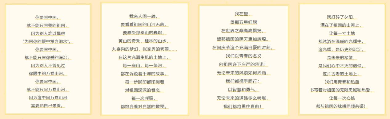 笔墨抒怀:以文字勾勒山河壮美。活动以“爱国”为核心命题,鼓励学生以原创文字描绘祖国山河、历史与未来。在“我打碎了夕阳”的创意续写环节中,学子们以诗意语言抒发对祖国的深情:“我打碎了夕阳,洒在祖国的山河上,让每一寸土地都沐浴在温暖的光辉中。这光辉,是历史的沉淀,是未来的希望,是我们心中不灭的信仰。”另一组作品则通过“你要写祖国,就不能只写祖国”的排比句式,层层递进展现祖国的多元魅力:“要写那历史长河中沉淀的智慧,写那山川河流间回荡的壮歌,写那四季更迭里不息的生机,写那岁月深处不变的温暖……”