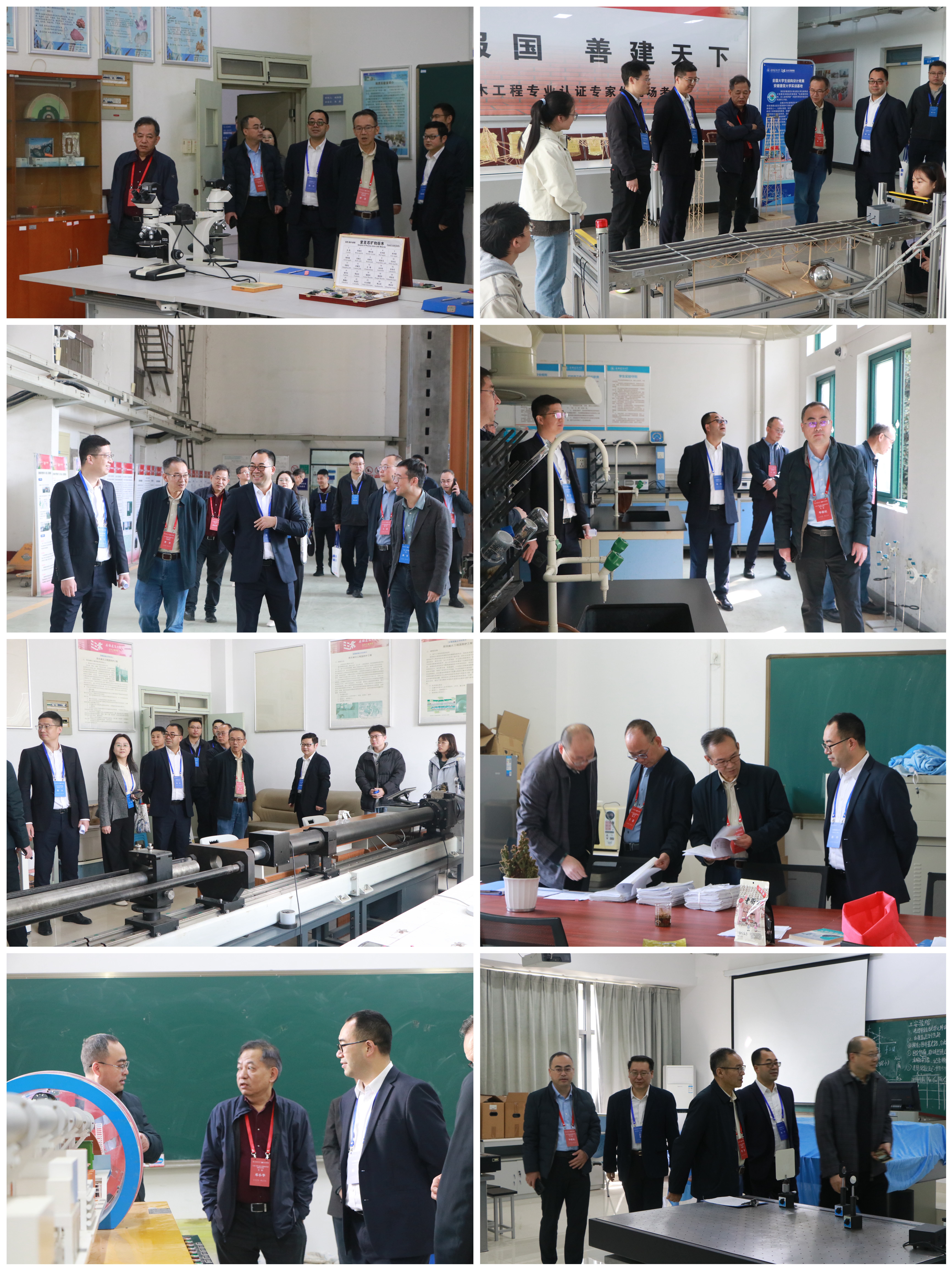 曹净教授代表专家组介绍考查目的与流程,并就自评报告有关问题与相关人员进行交流。随后,专家组考查走访了大学物理实验室、结构大厅、地下实验室、力学实验室、地质实验室、土工实验室等教学场所,以及中建海龙实践教学基地。