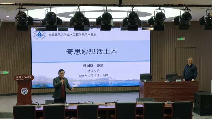 本网讯 2025年12月13日上午,浙江大学梅国雄教授受邀来我院作学术报告,报告会由土木工程学院副院长施国栋主持,学院教师和学生近百人聆听了讲座。