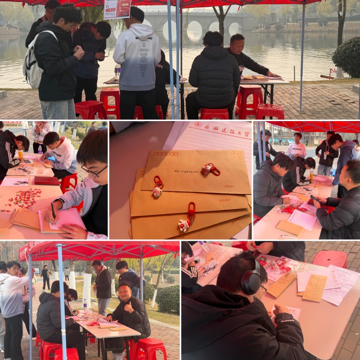 活动前期,学院学生会提前紫云路校区北食堂门口规划布置书写专区,精心准备了素雅信纸、定制信封及兼具纪念意义的小礼品,为同学们营造了温馨静谧的书写氛围。活动现场,同学们或静坐沉思,或提笔疾书,将对未来的憧憬、学业上的目标、生活中的期许一一诉诸笔端:有学子立志攻克结构力学、BIM 技术应用等专业难题,誓在专业领域深耕不辍;有同学期许在全国大学生结构设计竞赛等赛事中崭露头角,展现土木学子的专业素养;也有不少同学盼望收获真挚的同窗情谊,在青春路上并肩同行。书写完毕后,同学们认真密封信件,郑重写下个人信息并交由工作人员统一保管。学院将为这些“时光信物”提供专属存放空间,妥善珍藏这份份初心与期许,待明年此时,再逐一返还给同学们,开启一场跨越四季的青春“对话”,检验成长与蜕变。
