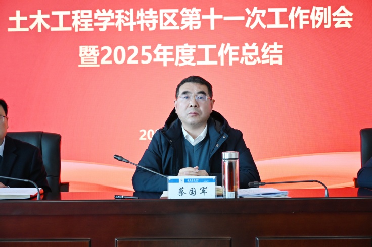 本网讯 2026年1月6日,土木工程学科特区第十一次工作例会暨2025年度工作总结会在徽风楼21楼第一会议室举行。会议由校党委副书记、校长蔡国军主持,校党委常委、副校长杨科,校党委常委、副校长王佐才出席。土木学院、环能学院、材化学院相关负责人以及学科特区骨干成员参会,共同总结2025年度学科特区建设成效,并对下一步发展任务进行谋划与部署。