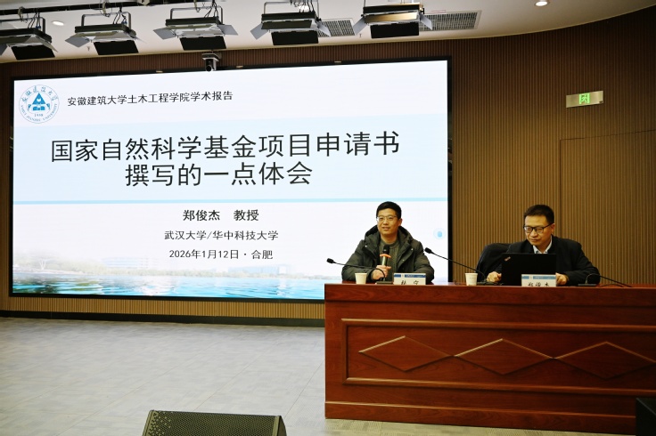 本网讯 2026年1月13日下午,武汉大学/华中科技大学郑俊杰教授受邀莅临我院,作国家自然科学基金项目申报专题学术报告。报告会由土木工程学院院长张宁主持,学院近百名师生现场聆听学习。