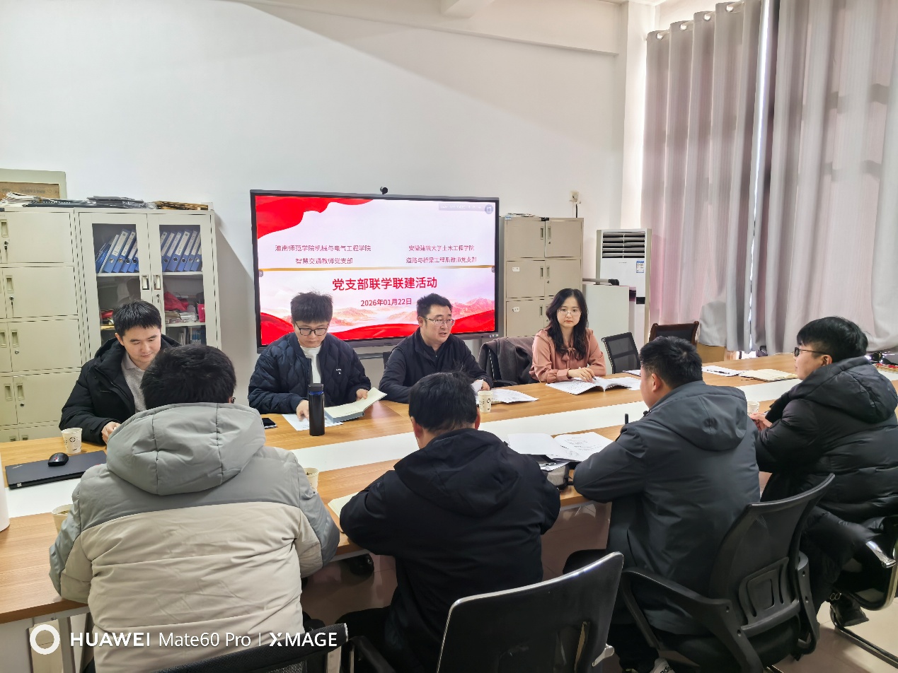 本网讯 为深化校际合作,推动党建工作与专业建设深度融合,2026年1月22日下午,安徽建筑大学道路与桥梁工程系教师党支部与淮南师范学院智慧交通专业教师党支部联合开展的“支部联学共建活动暨交通类专业建设交流会”在安徽建筑大学土木工程学院成功举行。活动旨在通过党建交流凝聚共识,以党建引领推动两校在交通运输类专业的学科建设、人才培养、教学科研等方面的深入合作与共同发展。