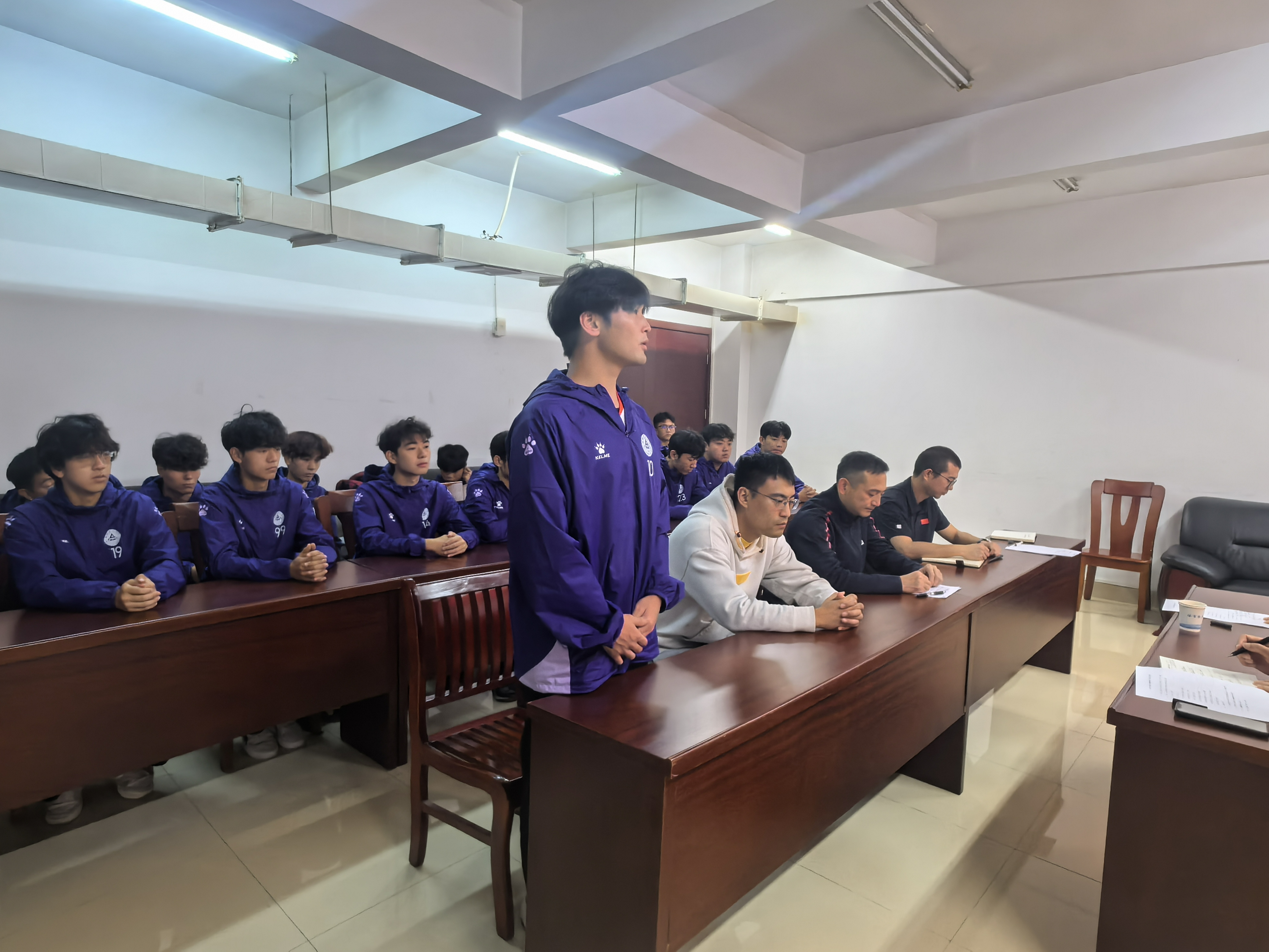 杨科强调:一是要坚持安全第一的原则,队员们在训练和比赛中务必注重人身安全,做好运动防护,避免伤病。二是要处理好训练比赛与学业之间的关系,劳逸结合,相互促进,在积极投入赛事的同时,确保学业进度不受影响。三是全体队员务必要深刻领会参赛的重要意义,敢于面对强手,敢打敢拼、认真对待每一场比赛。