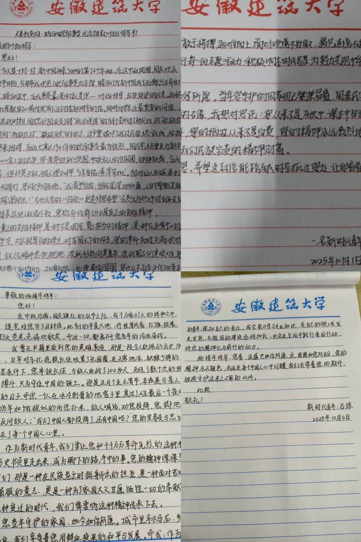 “今天是国庆,窗外万家灯火、国泰民安,我想把这份安宁与美好,说给您听……”在“写一封致敬英雄的信”活动中,同学们以笔墨为媒介,跨越时空与英雄对话。2025级学生张颖为叶挺将军写下书信,她在书信中动情写道:“今日之中国,已如您所愿。当年您守护的国家现已繁荣昌盛、国泰民安。在纪念馆中,面对着您的塑像,我想对您说:您从来不是历史中、课本中冰冷的符号,而是我们崇敬的榜样。您的牺牲从来不是白费,您的精神永远激励着一代又一代的我们,至今依旧是我们民族宝贵的精神财富。”