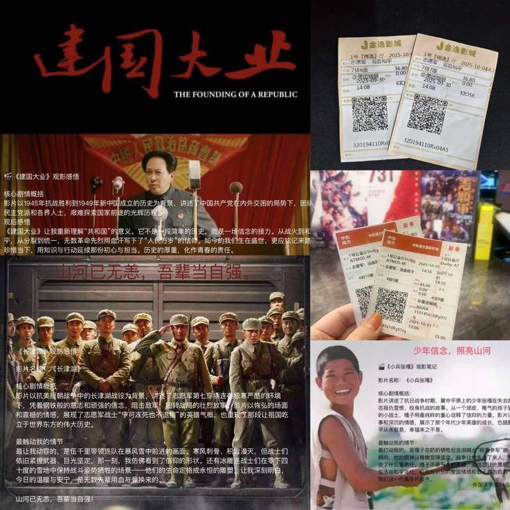 为引导学子在艺术熏陶中深刻感悟抗战精神,学院精心策划了红色观影学习活动。活动筛选并推荐了《南京照相馆》《长津湖》等兼具思想深度与艺术感染力的经典红色影片,还鼓励学生结合个人兴趣自主选择其他红色影视作品,通过灵活多样的观看形式开展观看学习。在观影过程中,学子们以不同方式留存与红色历史的联结,部分学生悉心保留电影票根,将其作为触碰历史、铭记精神的实物纪念;有的学生则选择以文字、图片为载体,将观影时的触动与思考凝练成详实的感悟笔记,笔记内容丰富、情感真挚,既有对影片中历史细节的深度剖析与解读,也包含对革命先辈英雄事迹的崇高敬意。