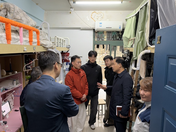 座谈结束后,黄多能一行再次深入学生宿舍,将温暖延伸至学生生活“最后一公里”,通过实地走访、亲切交谈,深入了解学生居住环境与日常需求。每走进一间宿舍,他都仔细察看住宿环境,关切询问同学们“宿舍里洗澡方便吗?热水供应稳定吗?洗衣机都在哪些位置?平时使用要不要排队?”并当场叮嘱后勤工作人员对学生提出的问题及时跟进解决,全力保障同学们能在安全舒适的环境中学习生活。此次宿舍走访,不仅让校领导精准掌握了学生的生活状态与实际需求,更让育人关怀突破了“会议室”的边界,融入宿舍生活的烟火气中,筑牢了校生沟通的“连心桥”。