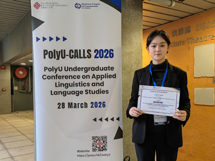 本网讯 3月28日,外国语学院2023级英语专业学生申洪乐赴香港参加“PolyU-CALLS 2026”应用语言学与语言研究会议。本次会议由香港理工大学英文与传播学系主办,面向全球在读本科生公开征集涵盖基础研究、方法论研究等领域的学术论文。申洪乐同学在外国语学院孔慧芳教授的悉心指导下,积极筹备并提交学术论文,经会议组委会评审,成功入选并获邀赴港参会,现场展示其论文研究成果。