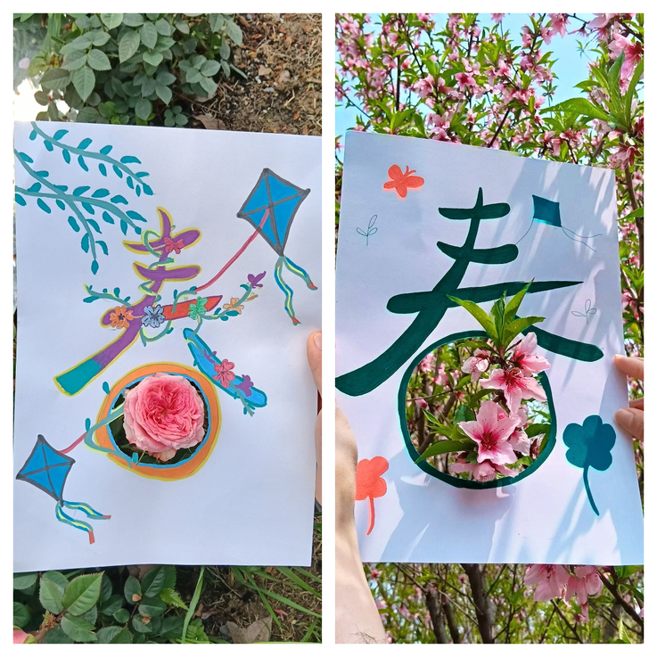 活动以汉字“春”为创意核心,鼓励同学们亲手制作镂空“春”字卡片,将校园春日盛景嵌入字间,以“字为框、景为画”的独特形式,定格春日美好。同学们走出宿舍、走进自然,在樱花、海棠、玉兰、杜鹃等春日繁花间取景创作,用画笔、手工与镜头,将汉字之美与自然之韵融为一体。一张张创意作品既展现了外院学子的审美创造力,也让同学们在亲近自然、动手创作的过程中舒缓了学业压力,放松了身心,实现了美育浸润与心理疏导的双向赋能。