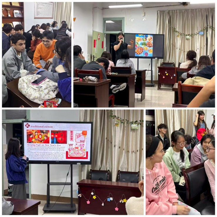 活动伊始,庞学通老师以沉稳亲和的语气开启开场白,他用简洁流畅的英语清晰地介绍了本次英语角的流程、主题与意义,瞬间拉进了与中外学生的距离,为整场活动奠定了轻松、开放的交流基调。随后,分享环节正式开启,成为整场活动的高光时刻,来自24级英语专业的孙紫妍、沈欣凭借深厚的文化积累,从春节的起源传说切入,到贴春联、守岁、拜年等传统习俗背后的文化内涵,将春节承载的团圆期盼与人文情怀用流畅的英语娓娓道来,让现场中外学子沉浸式领略我国传统节日的深厚底蕴。紧接着,塔吉克斯坦留学生Hardin登台,围绕本国传统节日Navruz,用生动鲜活的语言讲述了该节日的历史渊源、庆祝仪式与文化象征,充满异域风情的分享为现场注入了别样活力,让大家感受到不同文化的独特魅力。