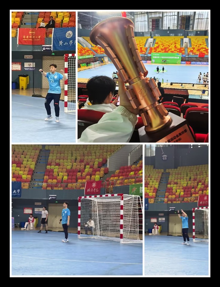 本届省运会手球比赛强手云集,校手球队在小组赛便遭遇严峻考验。首战对阵传统劲旅合肥工业大学,终场读秒阶段面临致命进攻,潘越沉着应对、关键扑救,虽未逆转比分却稳住队友士气;次战安徽大学,他又飞身化解必进球,凭借出色技术化解危机。小组赛后两轮,潘越虽未获得出场机会,但他未有丝毫松懈,在替补席实时分析对手战术、为队友出谋划策,助力球队通过七米球大战连克强敌、成功晋级。交叉赛面对安庆师范大学的生死对决,他披挂上阵打满全场,在七米球决胜环节连续三次扑救,凭借一己之力为球队锁定胜局。此次征程,既是一场体育竞技的比拼,更是一次青春成长的历练。