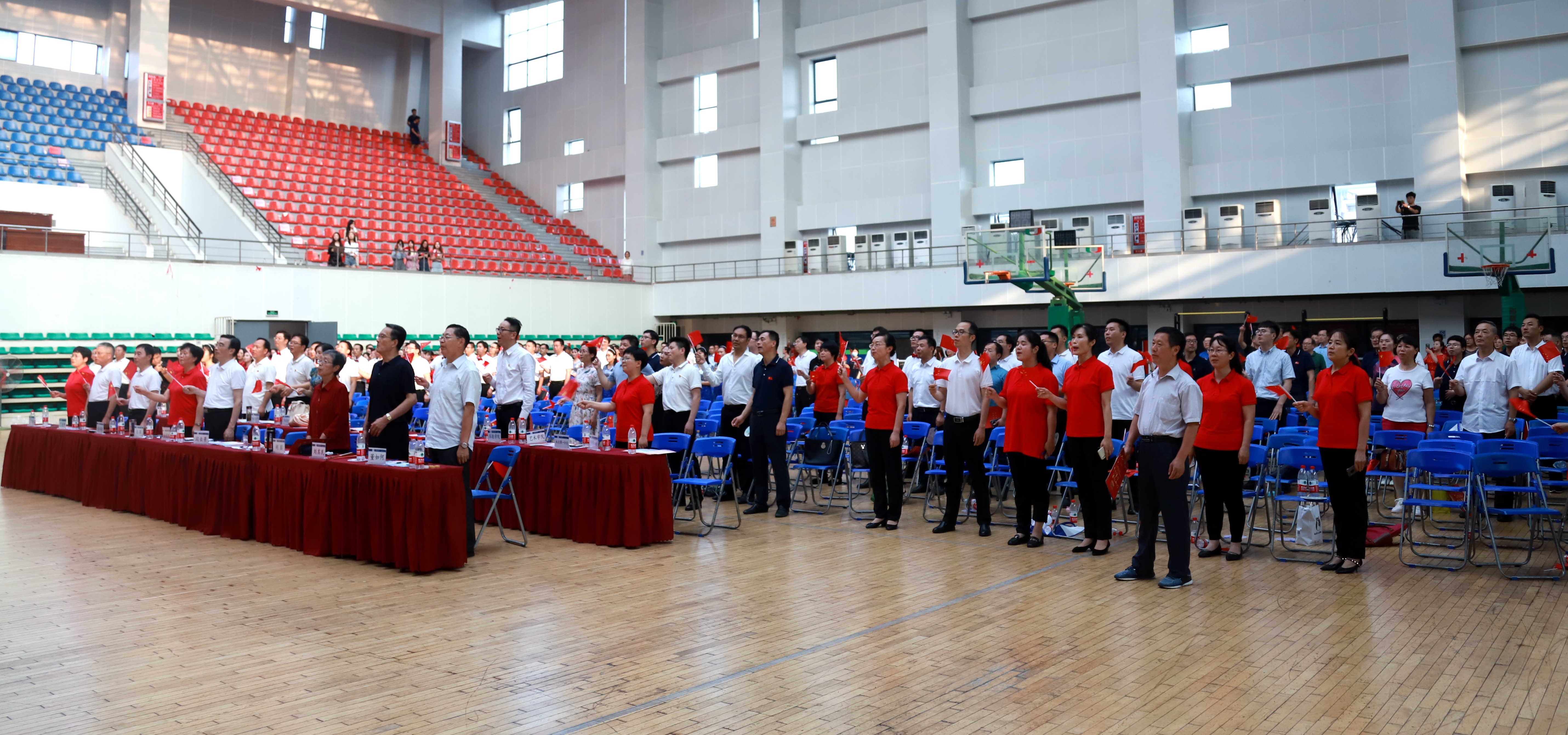 比赛最后,全场起立,共同高唱《没有共产党就没有新中国》,现场国旗挥舞,气氛热烈。