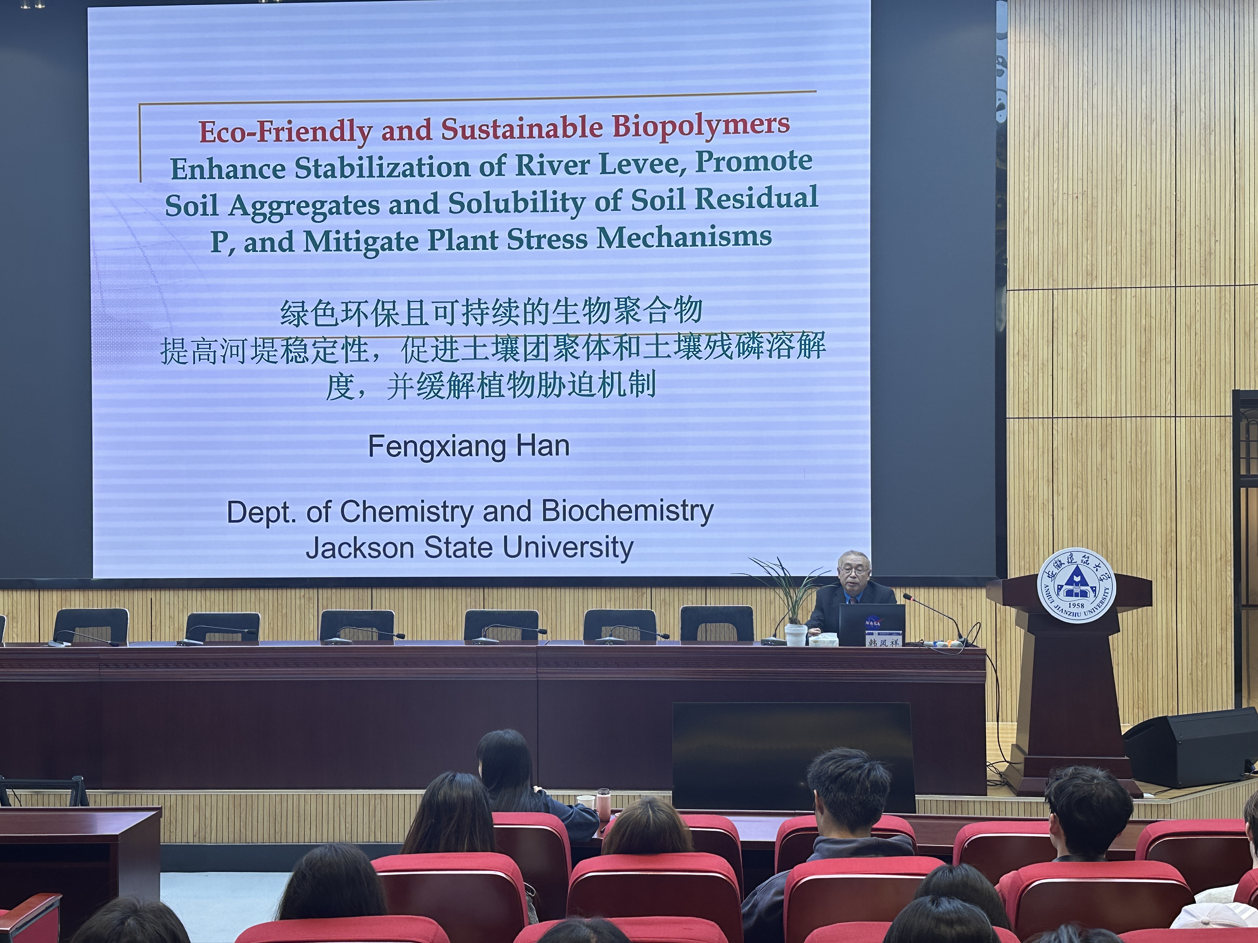 本网讯 近日,由校党委宣传部主办,建筑与规划学院承办的第125期“易海大讲堂”在徽韵楼二楼报告厅举行。美国杰克逊州立大学化学与生物化学系韩凤祥教授应邀做客“易海大讲堂”,为全校师生带来《绿色环保且可持续的生物聚合物提高河堤稳定性,促进土壤团聚体和土壤残留磷溶解度以及缓解植物胁迫机理》的精彩报告。建筑与规划学院姚晓洁教授主持讲座,学院相关骨干教师、研究生及本科生100余人参加了本次报告会。