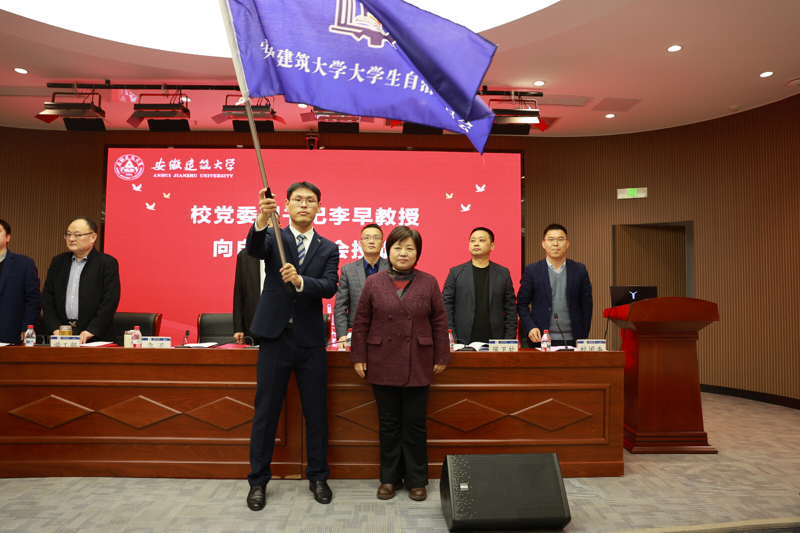 会议举行了授旗仪式,李早向大学生自治管理委员会授旗,并与参会嘉宾一同为自治委员会首届委员颁发聘书。