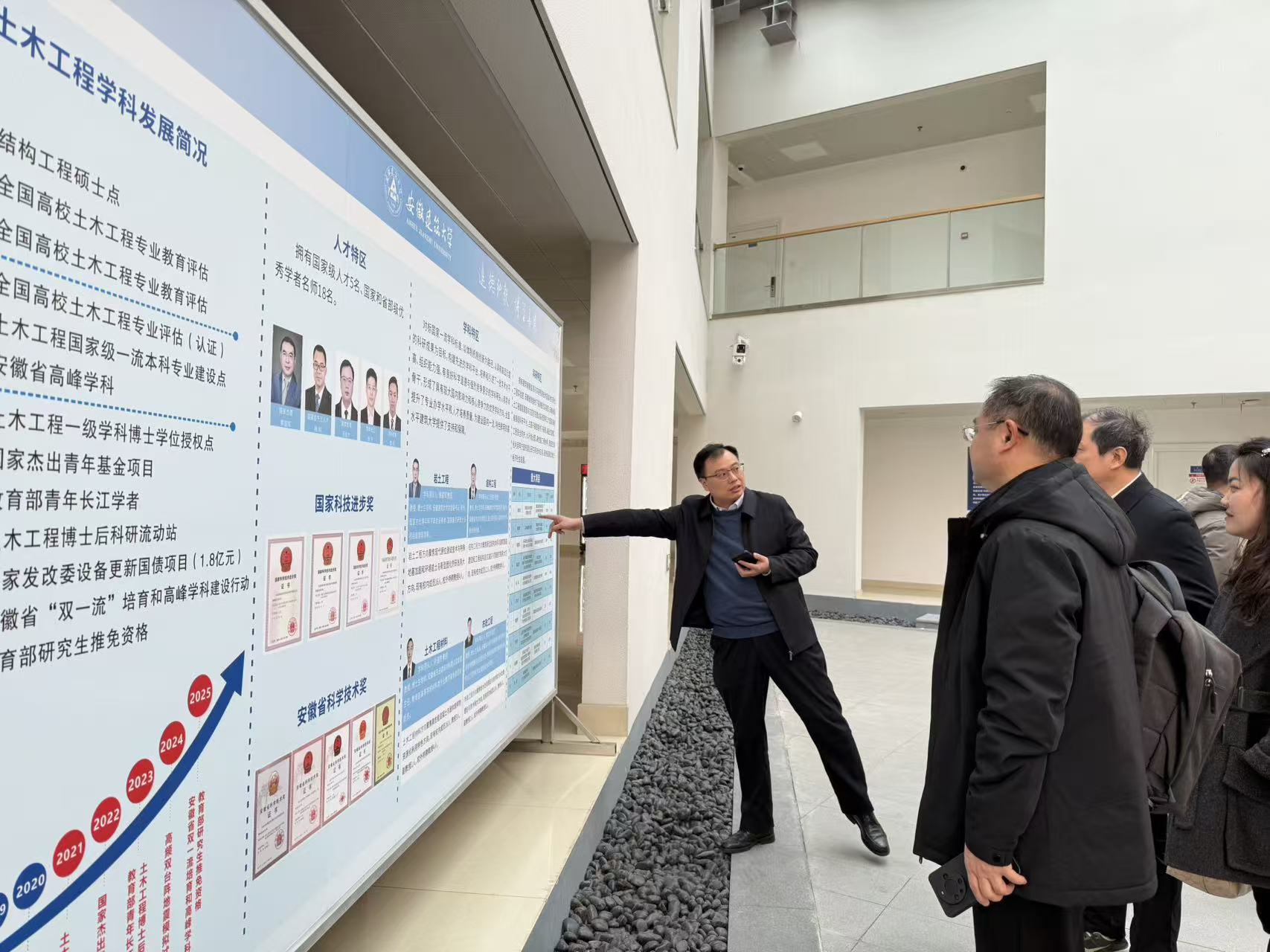 本网讯 12月4日上午,安徽省教育厅专家组朱曙培一行到访安徽建筑大学,对学校申报的建筑工程管理类“双师型”教师培训基地开展全方位实地考察。考察活动通过学校专题汇报、企业合作方陈述、专家集中反馈及实地调研等多个关键环节,系统评估基地申报规划的科学性、资源保障的坚实度与校企合作的深度,为基地高质量落地精准把脉、定向领航。