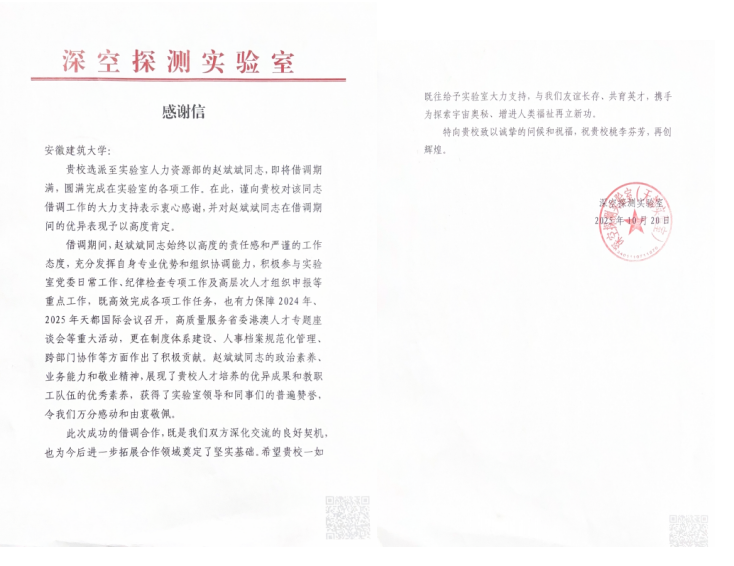 本网讯 近日,我校收到来自深空探测实验室的感谢信,对选派的赵斌斌同志在借调期间的工作表现给予了高度肯定,并对学校在人才支持方面作出的贡献表示衷心感谢。
