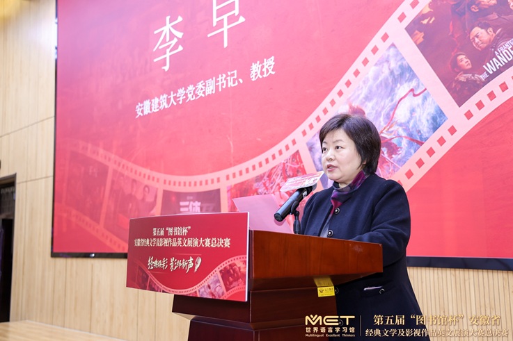 总决赛现场,安徽建筑大学党委副书记李早代表承办方致辞,向全体嘉宾、评委和参赛选手表示热烈欢迎,对大赛的举办表示祝贺。她指出,本次活动是弘扬中华优秀传统文化、推动跨文化交流的生动实践,展现了我省学子扎实的语言功底和良好的综合素养,并预祝大赛取得圆满成功。