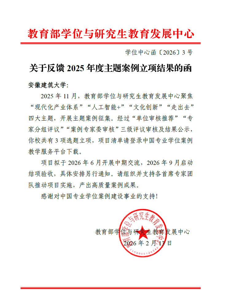 本网讯 近日,教育部学位与研究生教育发展中心(简称“学位中心”)公布了2025年度主题案例立项结果,安徽建筑大学经管学院3项主题案例获批立项,覆盖“现代化产业体系”“人工智能+”“走出去”三大主题。