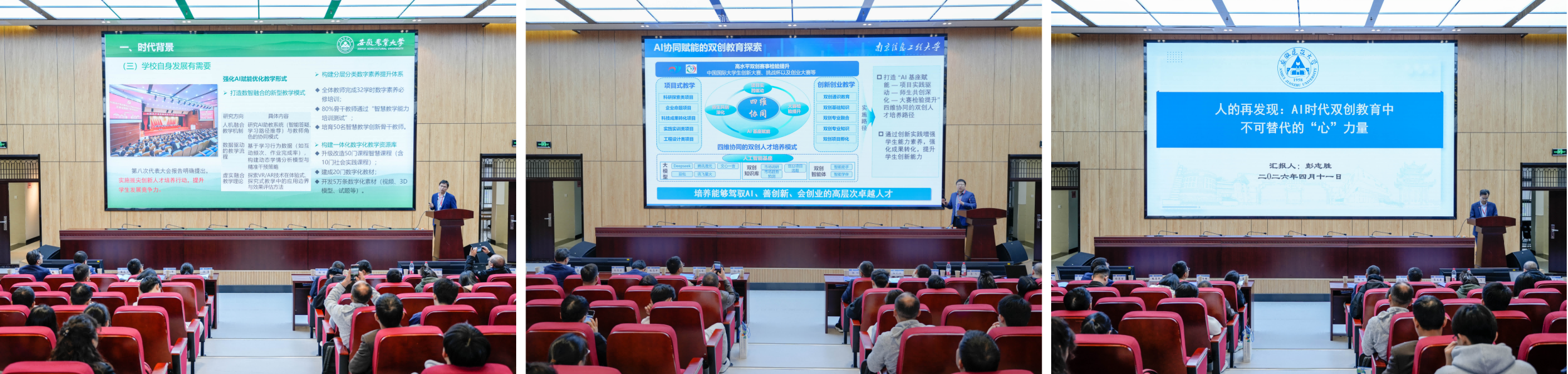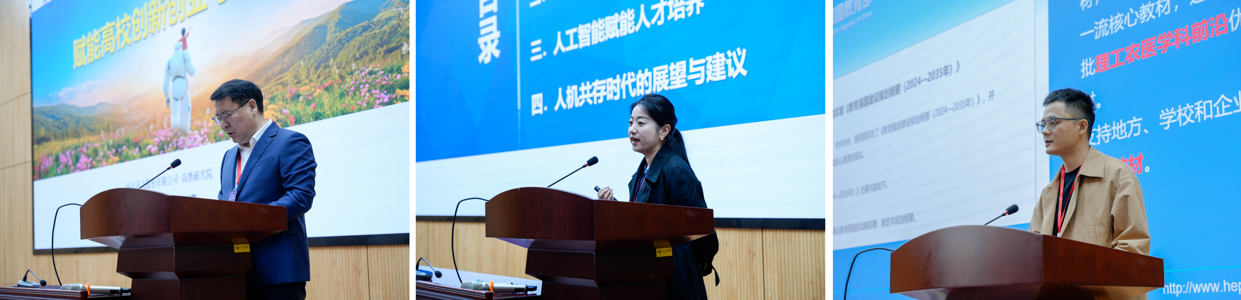 主旨报告第二阶段,安徽农业大学创新创业学院常务副院长张志平围绕《赛教融合2.0:AI驱动的竞赛型双创人才培养模式》展开分享,为“以赛促创、以赛促教”提供了可复制的路径。南京信息工程大学教务处副处长孙玉宝以《人机协同新范式:培养AI不可替代的创新创业人才》为题,提出要在AI技术赋能的同时,强化学生创新思维、协作能力、人文素养的培育。最后,安徽建筑大学经济与管理学院院长彭志胜以《人的再发现:AI时代双创教育中不可替代的“心”力量》为题,从教育本质出发,强调AI时代双创教育更需坚守“立德树人”根本,关注学生的情感、价值与责任担当,培育兼具技术能力与人文情怀的新时代双创人才,引发了与会嘉宾的深度共鸣。